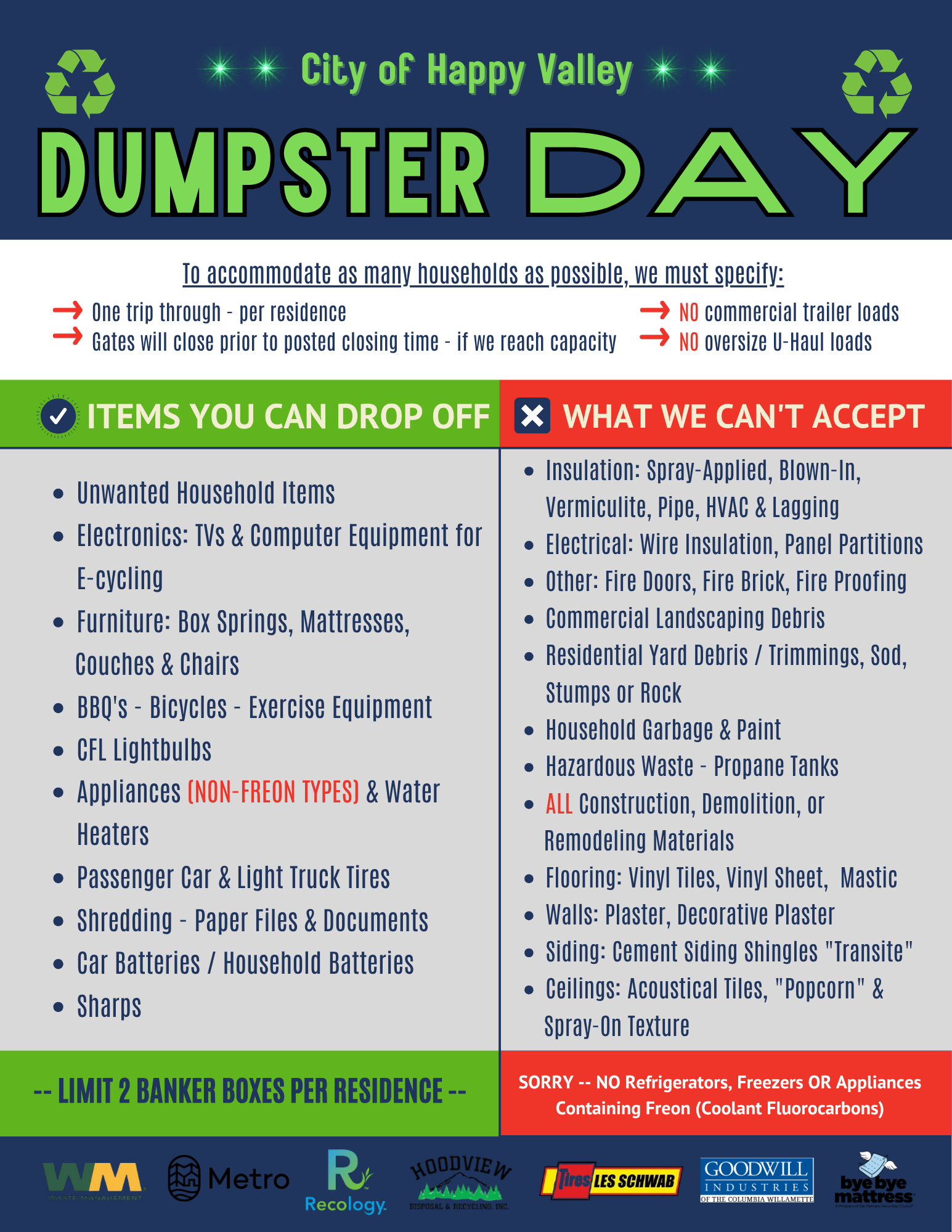 The City would like to thank the following community partners for helping make this year’s Dumpster Day possible: Waste Management, Hoodview Disposal, Recology, Metro, Goodwill, Les Schwab Tires, Reborn Bikes, and Mattress Recycling Council.