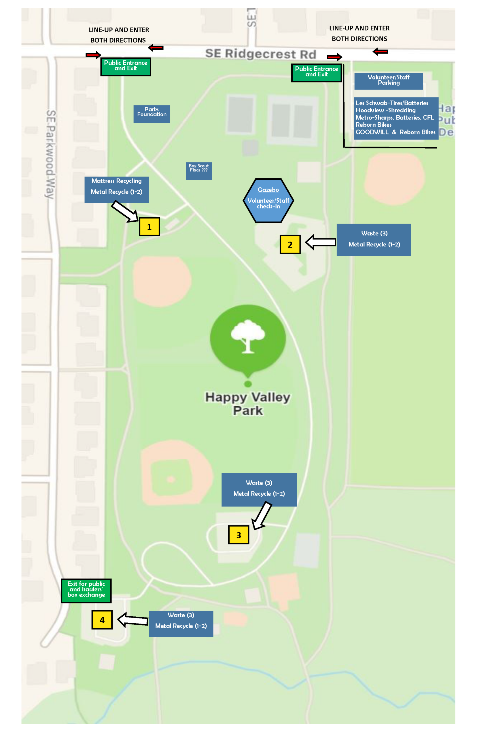 While we will do what we can to expedite the line and volunteers will be available should you need help, please support our efforts by being ready when it is your turn to unload your vehicle and make room for the next resident by exiting the area once you are finished. Please plan accordingly as there may be significant wait times to access various stations. Your partnership is crucial to helping us continue to provide this complimentary service to all residents of Happy Valley.