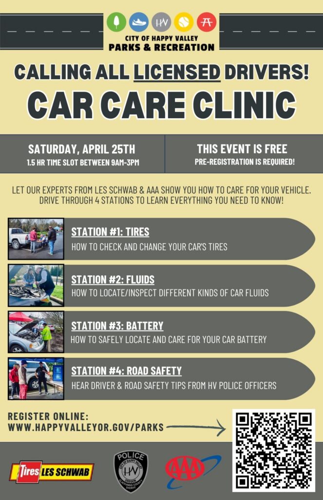 Parks and Recreation, in collaboration with Les Schwab, AAA, and Happy Valley Police, invites you to our FREE Car Care Clinic! Whether you’re a new driver or a seasoned road veteran, this event is tailored to equip you with essential car maintenance skills and road safety tips.