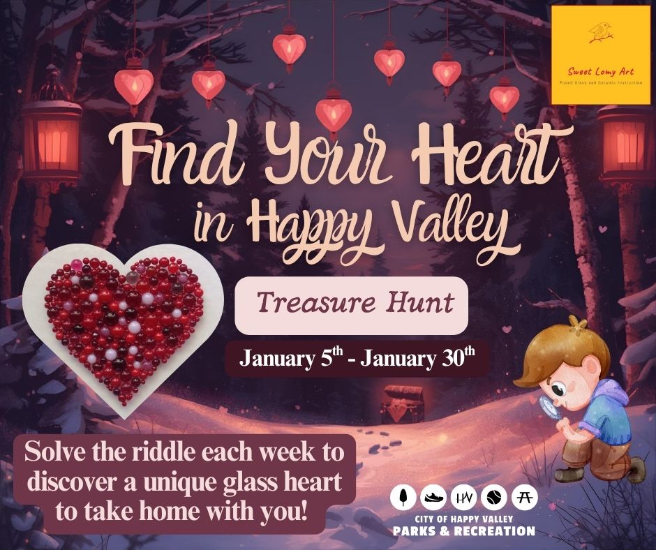 Happy Valley Parks and Recreation is kicking off the new year with a city-wide treasure hunt so you can Find Your Heart in Happy Valley! From January 5th – January 30th, residents of all ages are invited to search for handmade glass hearts, each one lovingly created by local artist Sweet Lomy Art, hidden at various locations throughout the community.