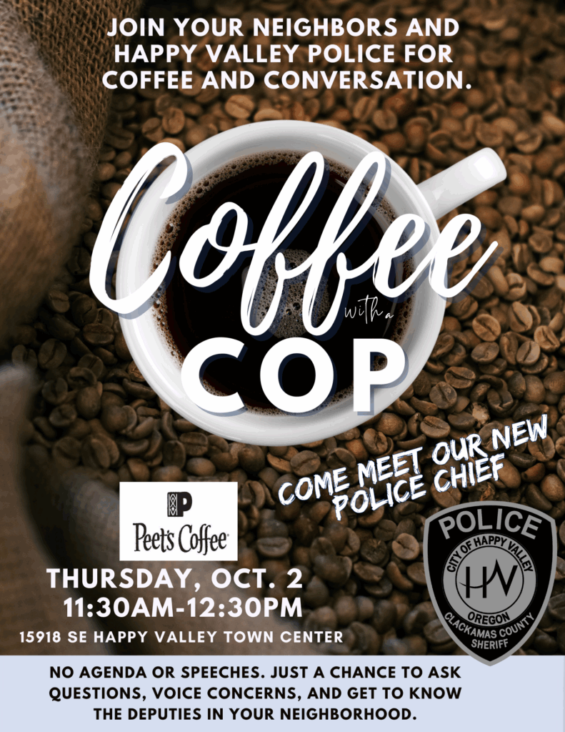 « All Events This event has passed. Coffee with a Cop October 2 @ 11:30 am - 12:30 pm « Library Board Meeting Oktoberfest » + Google Calendar+ Add to iCalendar Details Date: October 2 Time: 11:30 am - 12:30 pm Event Category: Featured Venue Peet’s Coffee 15918 SE Happy Valley Town Center Happy Valley, + Google Map Related Events Traffic and Public Safety Meeting November 20 @ 6:00 pm - 8:00 pm All city facilities are closed for Thanksgiving November 27 All city facilities are closed today, Friday, November 28th November 28