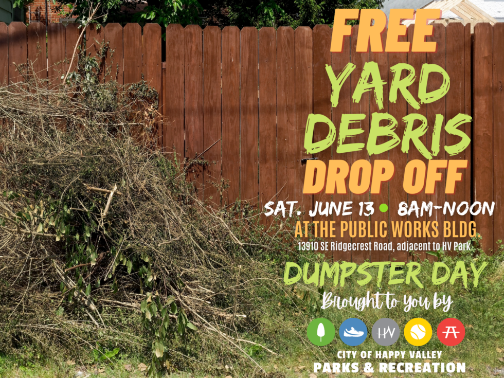 « All Events Yard Debris Drop Off – FREE June 13 @ 8:00 am - 12:00 pm « Dumpster Day Happy Valley Art Committee » + Google Calendar+ Add to iCalendar Details Date: June 13 Time: 8:00 am - 12:00 pm Event Category: Featured Venue Happy Valley Public Works Building 13910 SE Ridgecrest Road Happy Valley, OR 97086 United States + Google Map Related Events City Council Work Session April 21 @ 6:00 pm - 7:00 pm City Council Meeting April 21 @ 7:00 pm - 8:00 pm Budget Committee Meeting May 5 @ 6:00 pm - 7:00 pm