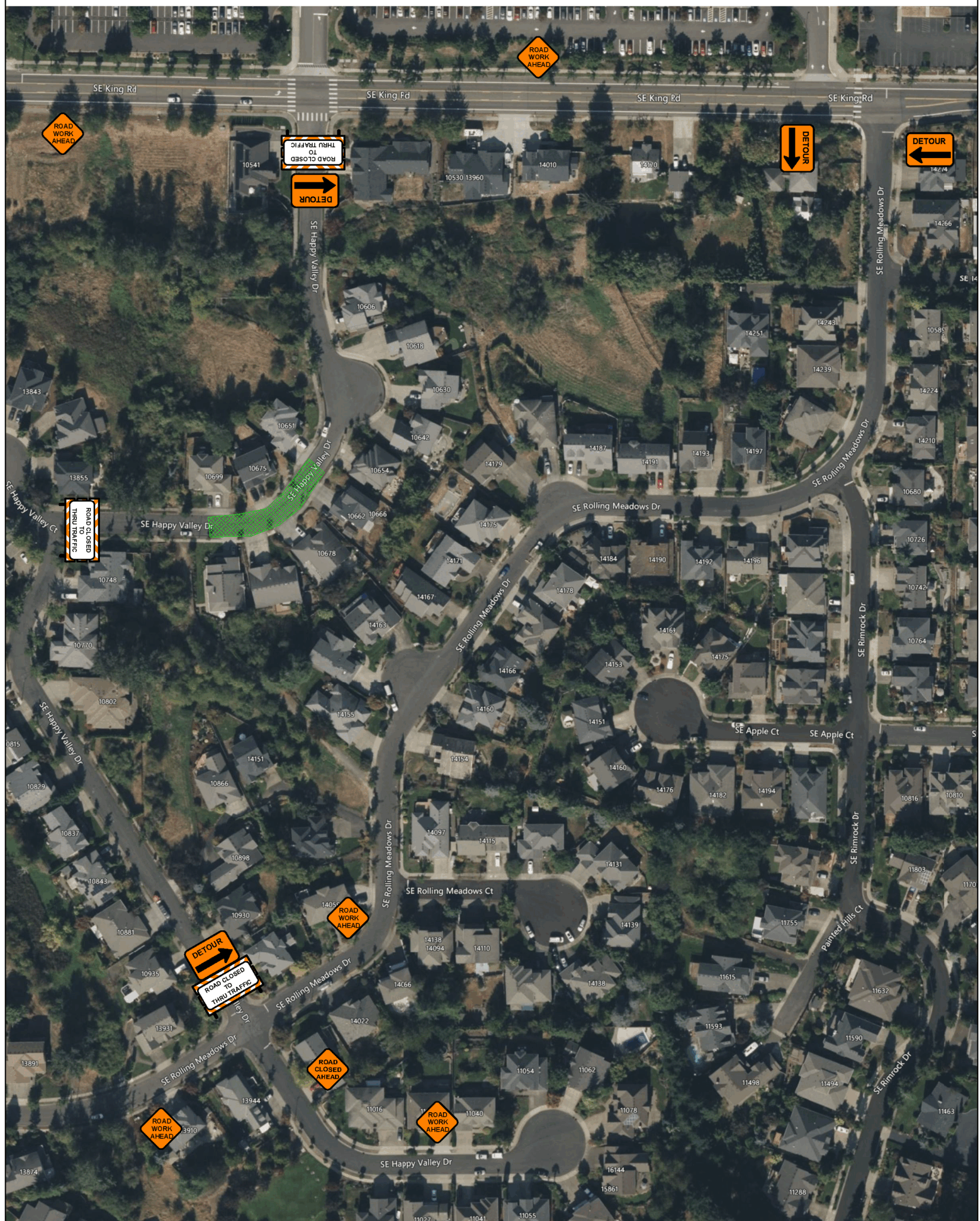 October 13, 2025 Happy Valley residents – be aware that SE Happy Valley Drive between SE King Road and SE Happy Valley Court will be closed starting Monday, October 13th through the end of the month. The road closure is part of a stormwater improvement project.