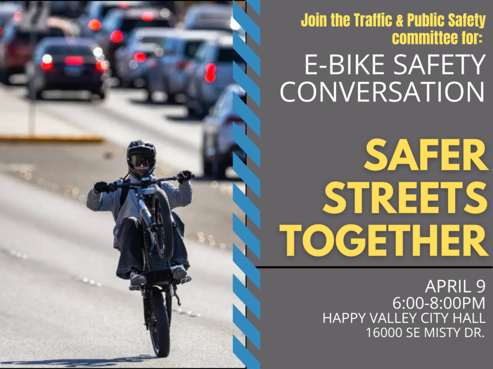 We are inviting residents, parents, riders, and community members to join us at an upcoming Traffic & Public Safety Meeting on April 9th, 6-8pm, at City Hall. This meeting will be focused on e-bike/e-scooter use in our community. This will be a town hall style conversation where we want to hear your ideas, experiences, and concerns.