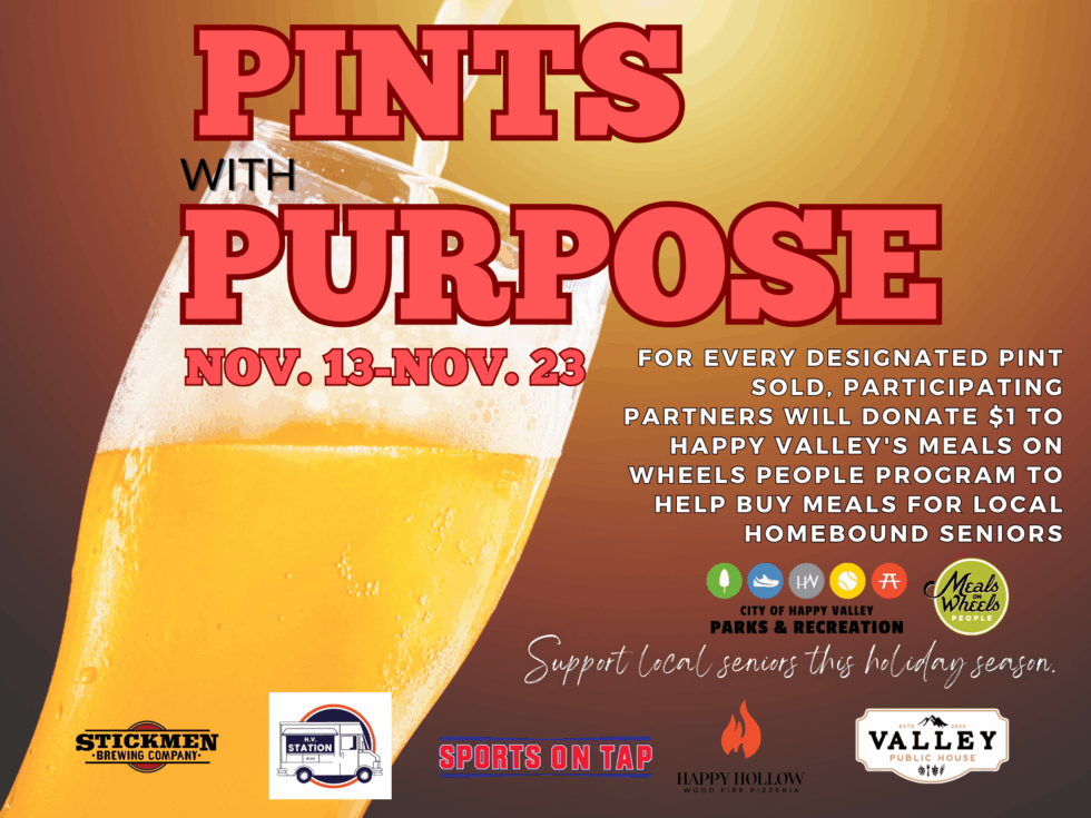 Pints with Purpose – Cheers to giving back! From Nov. 13–23, join five local taphouses and eateries and Happy Valley Parks and Recreation for Pints with Purpose, supporting the City’s Meals on Wheels People program.