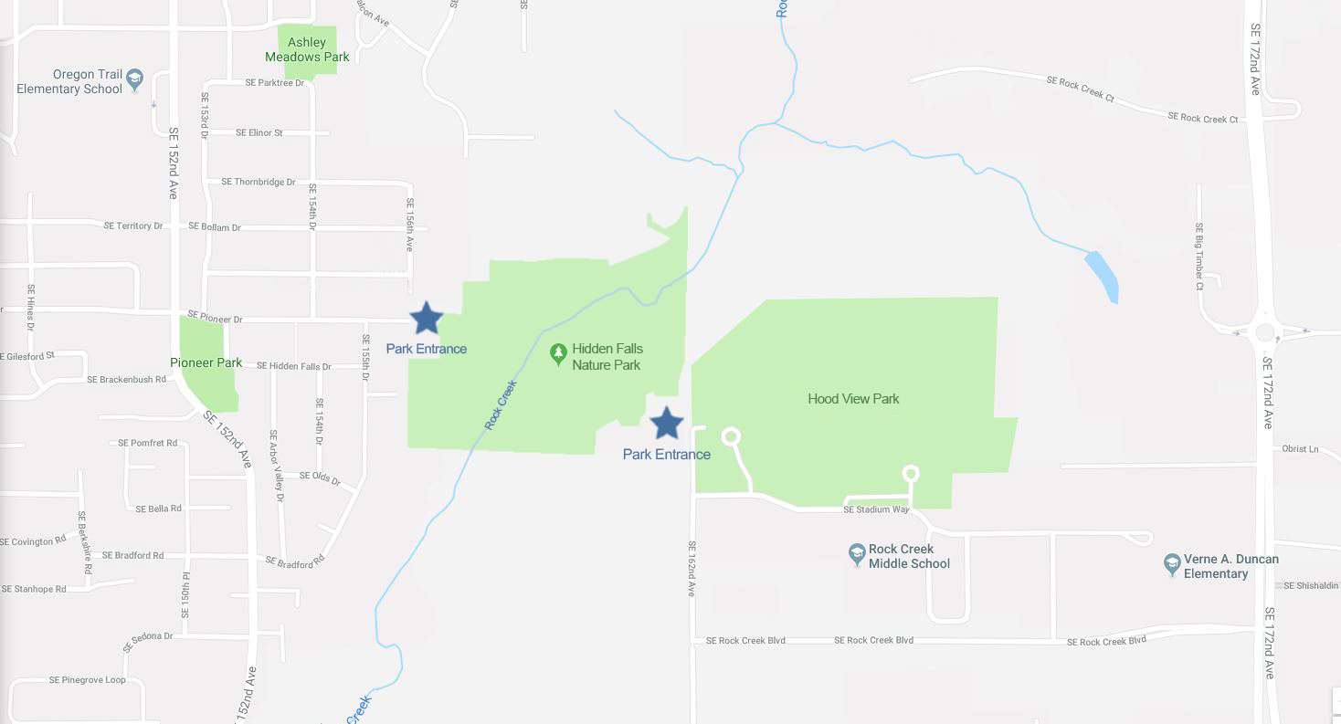 Located in Happy Valley, there are two main access points to Hidden Falls Nature Park. To the north of Rock Creek, there is an entrance at Pioneer Dr. and 156th Ave. To the south of Rock Creek, there is an entrance point on 162nd Ave., just past the dead end and alongside Hood View Park.